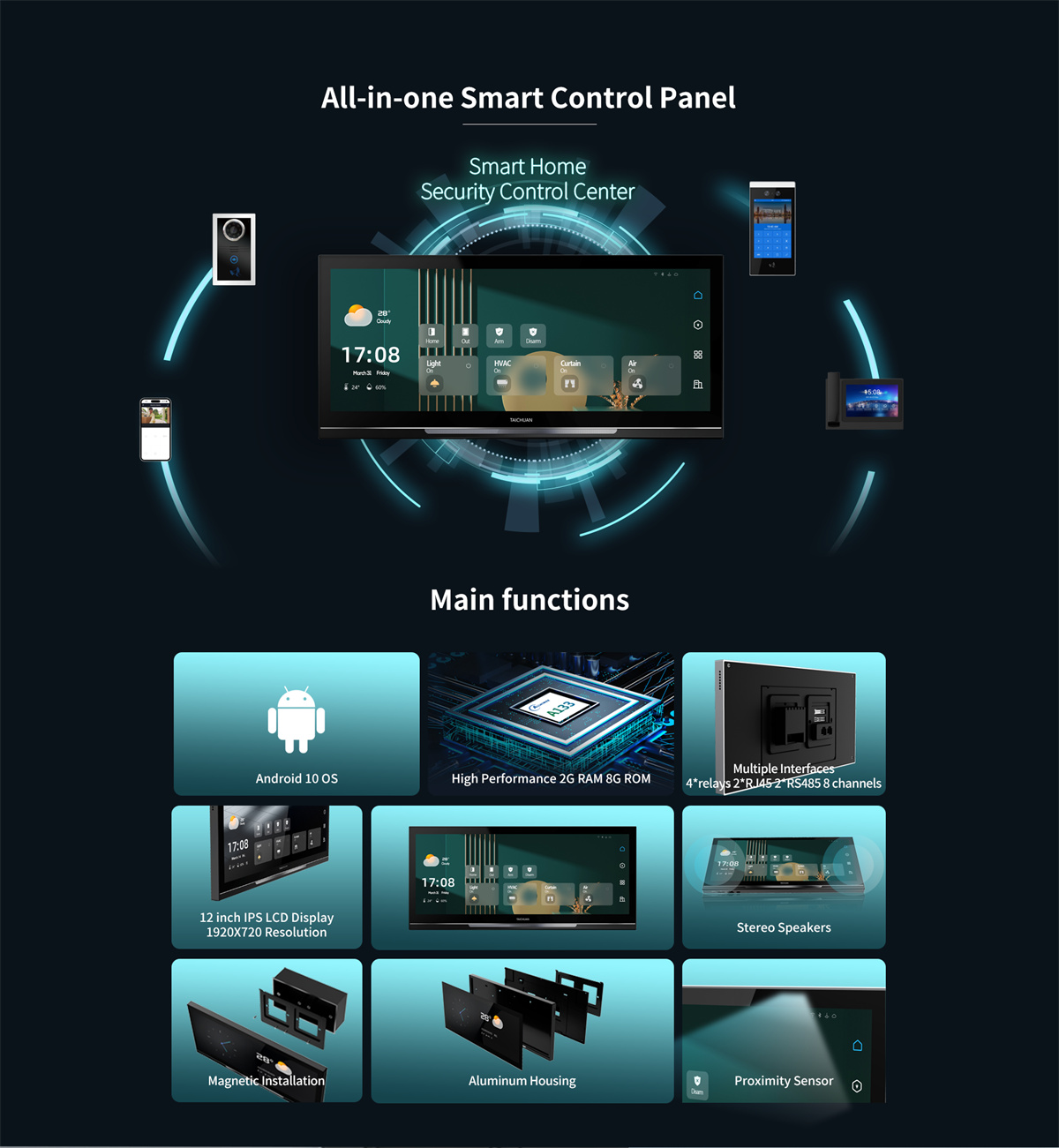 از نظر ارتباطی، پنل علاوه بر پورت شبکه (RJ45 – TCP/IP)، به Wi-Fi، بلوتوث و زیگبی داخلی مجهز است؛ یعنی همزمان میتواند نقش مرکز کنترل، گیتوی زیگبی و پنل تصویری داخلی را بازی کند. وجود ورودیهای آلارم سیمی (8 کانال) نیز این امکان را میدهد تا سنسورهای امنیتی و حفاظتی سنتی را به سادگی با سیستم هوشمند ترکیب کنید.